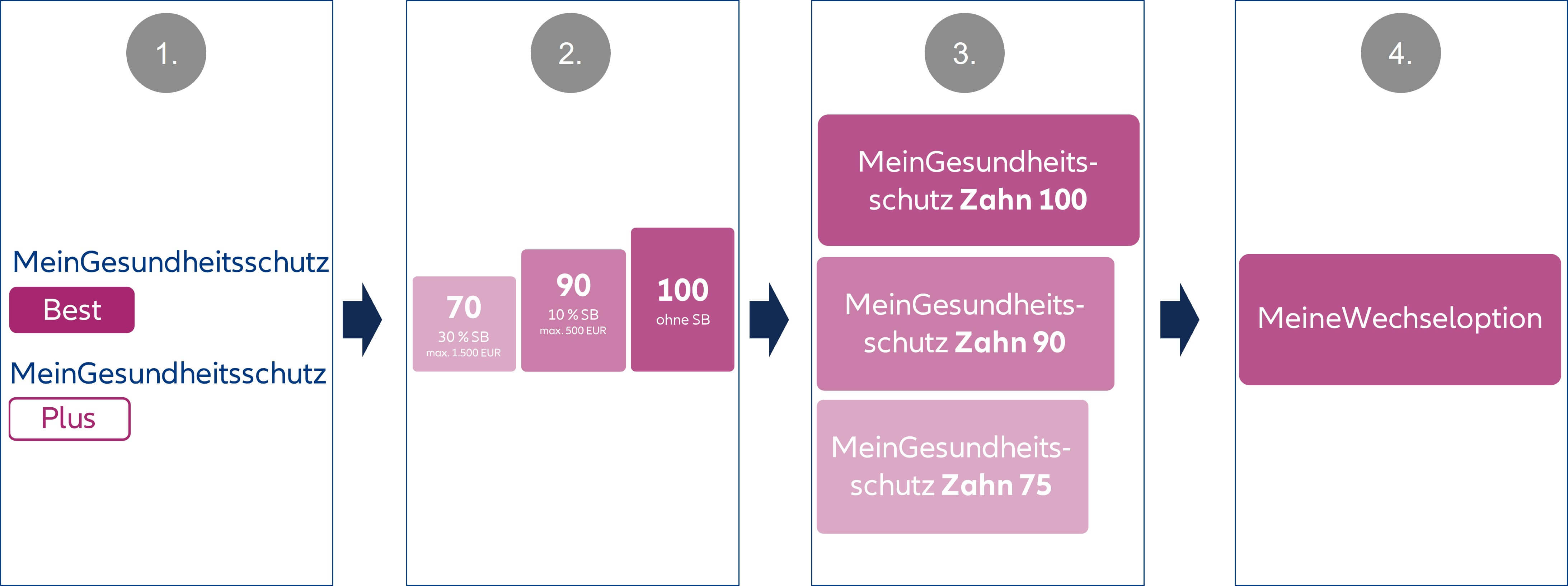 Und so einfach stellst Du die private Krankenversicherung individuell zusammen – in nur vier Schritten mit größtmöglicher Flexibilität: